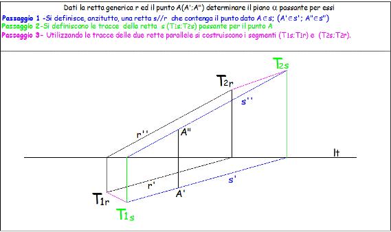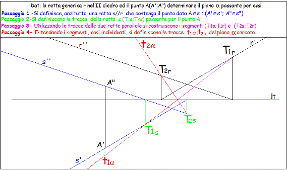 Ottenute le tracce (che dal punto di vista geometrico sono punti reali) della retta s si collegano le due tracce prime delle rette r ed s per ottenere un segmento di retta che definisce la direzione della t1a su p1 e le due seconde tracce delle rette r ed s per ottenere un segmento di retta che determina la direzione della t2a su p2